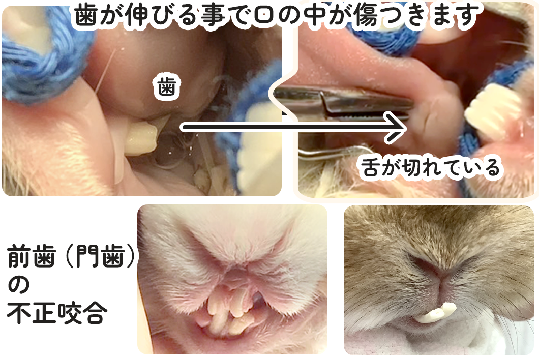 そのため、かみ合わせが悪くなると「不正咬合」を起こし、前歯(門歯)や奥歯が異常に伸びてしまいます。これにより食欲不振やよだれ、体重減少などがみられることがあります。