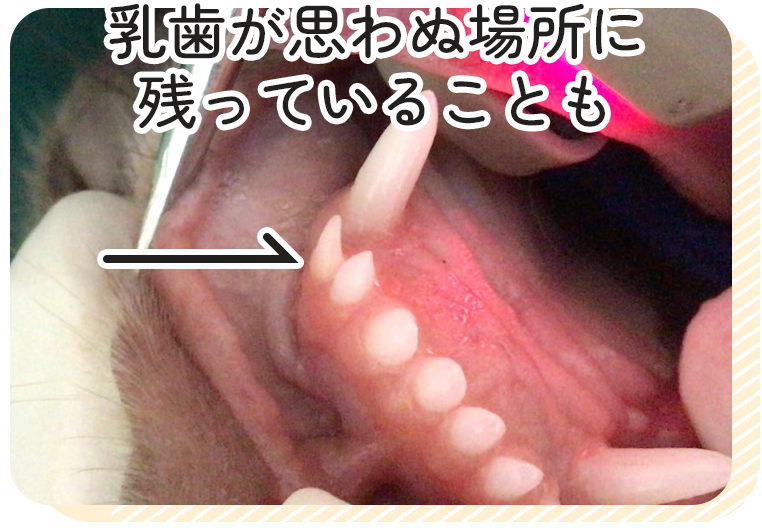 乳歯遺残があると、歯並びが悪くなったり、歯と歯の間に汚れが溜まりやすくなって歯周病の原因になることがあります。特に小型犬ではよくみられるため注意が必要です。