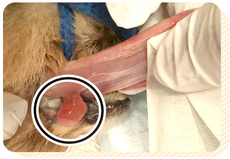 短頭種(パグ、フレンチブルドッグなど)に多く、呼吸がしづらくなる原因です。外科的に軟口蓋を整えることで呼吸が改善することがあります。
